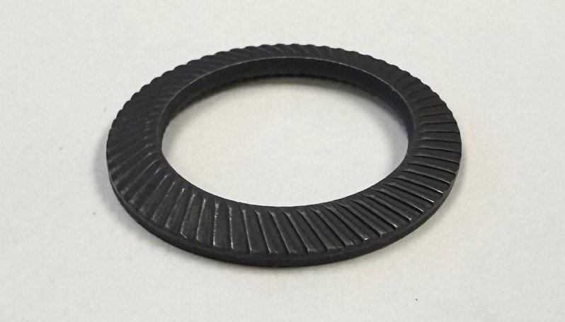 Safety washers are in the form of a disc spring but with a trapezoidal cross-section and serrations on both sides.