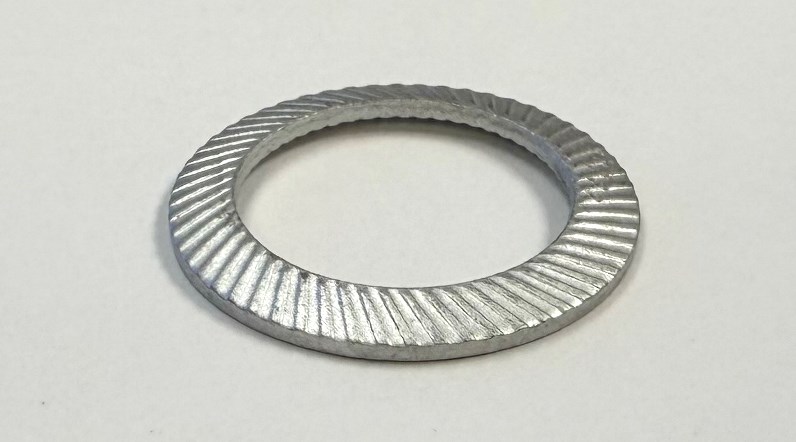 Safety washers are in the form of a disc spring but with a trapezoidal cross-section and serrations on both sides.